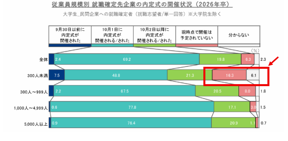 新卒採用にあたり、10/1前後は各企業で当たり前のように内定式を行うイメージですが、下記グラフ、従業員300名未満の企業において、約2割が内定式について「予定されていない」または「実施するのか分からない」となっております。